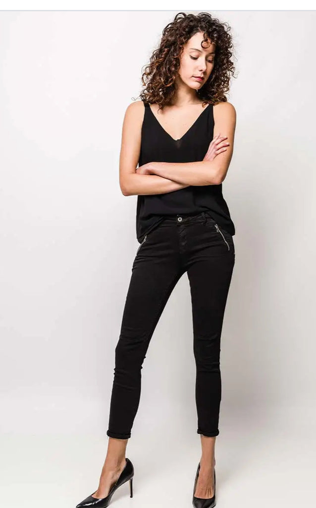 These jeans pockets on the front of the jeans which have a zip closure and two on the back of the jeans without zip closure
