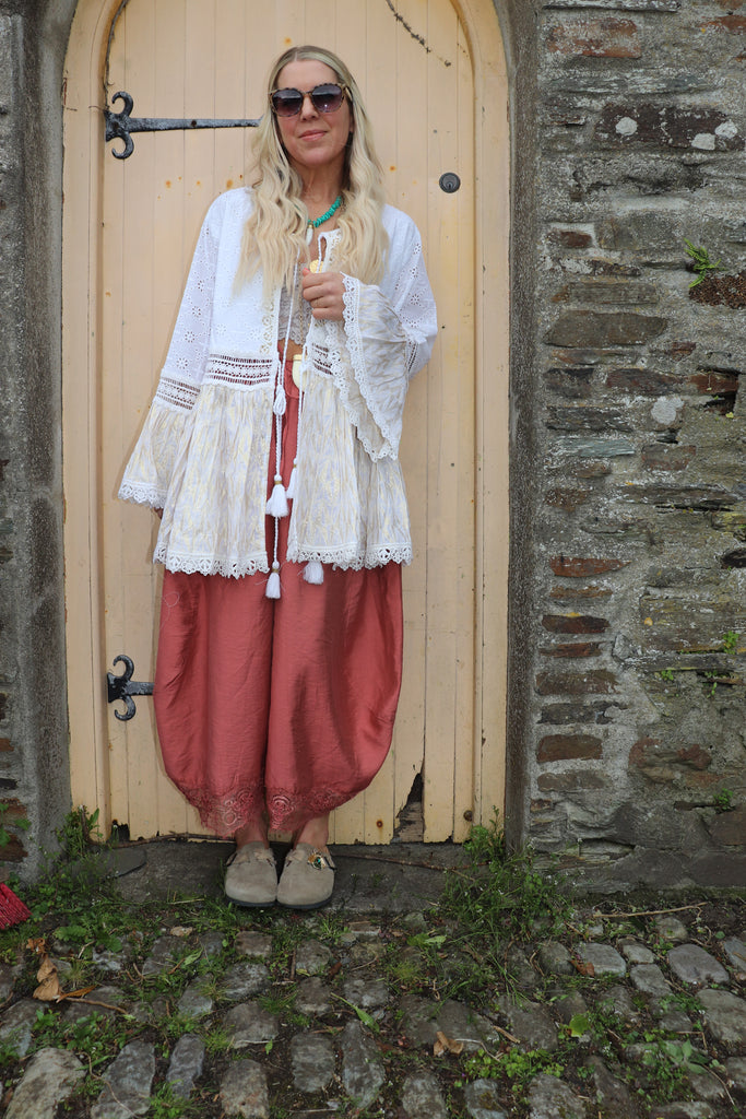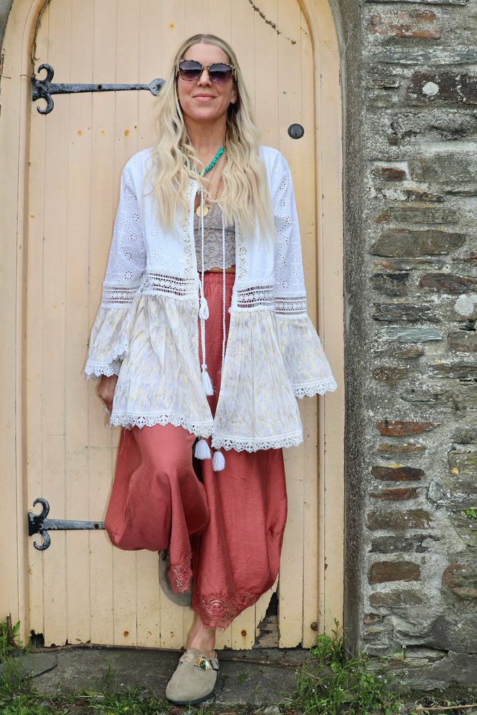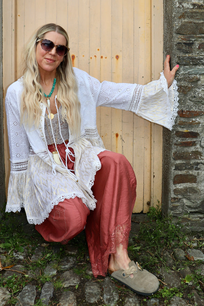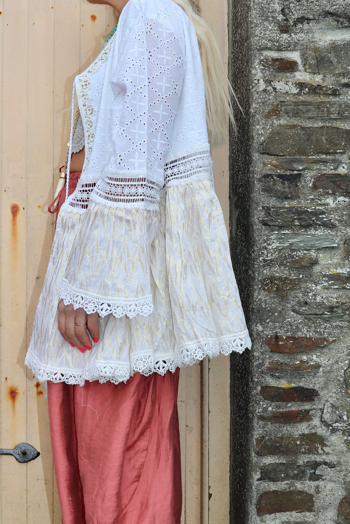 Embroidered crochet trim tiered kimono