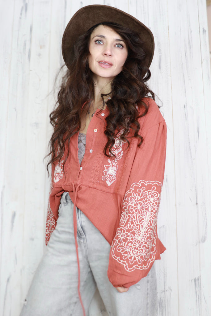 This blouse has a button opening that goes 3/4 of the way down the front of the blouse